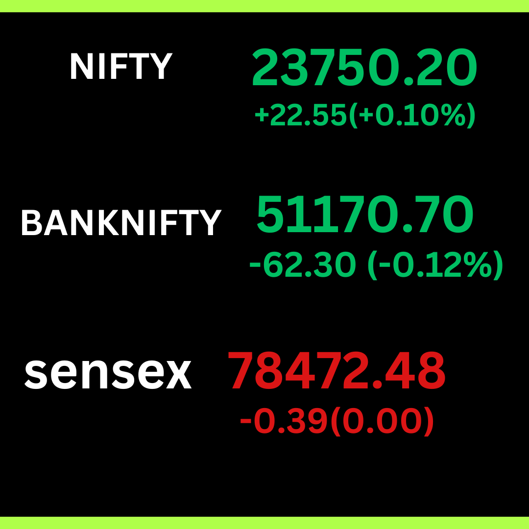 निफ्टी 23750 पर बंद हुआ जो की पिछले दिन से 22.55 पॉइंट बढ़त के साथ बंद हुआ और बैंक निफ्टी 51170 पर बंद हुआ जो किम पिछले दिन के बंद से 62.30 पॉइंट नीचे बंद हुआ जबकि sensex अपने पिछले दिन के बंद 78472 के पास ही बंद हुआ है