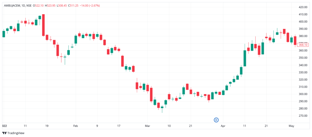 यह चार्ट Ambuja सीमेंट का है और इस चार्ट में दिखया गया HAMMER CANDLE मार्च 2022 में बना था –